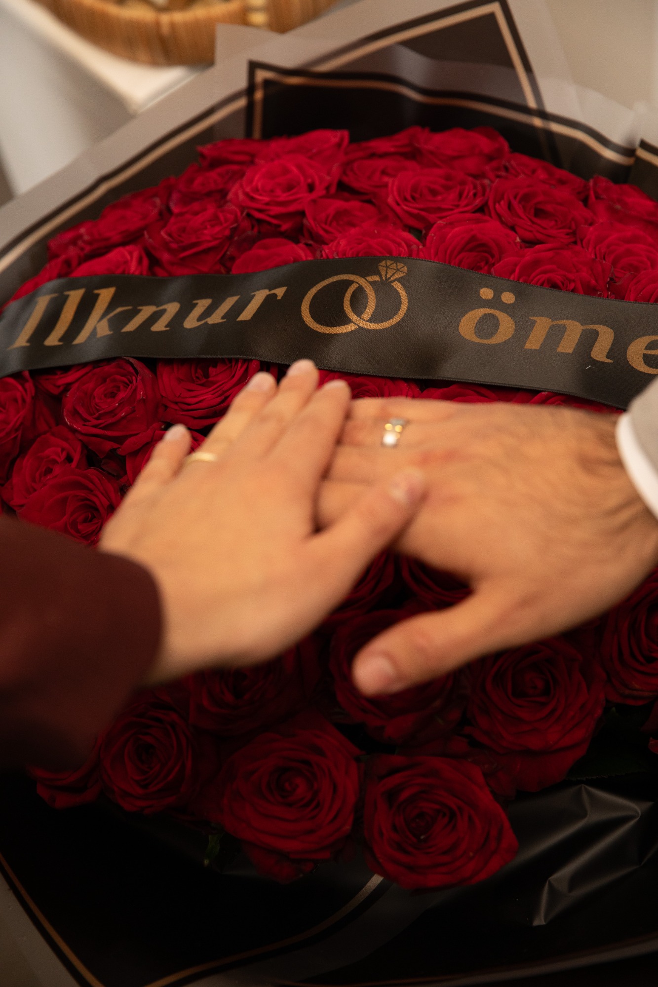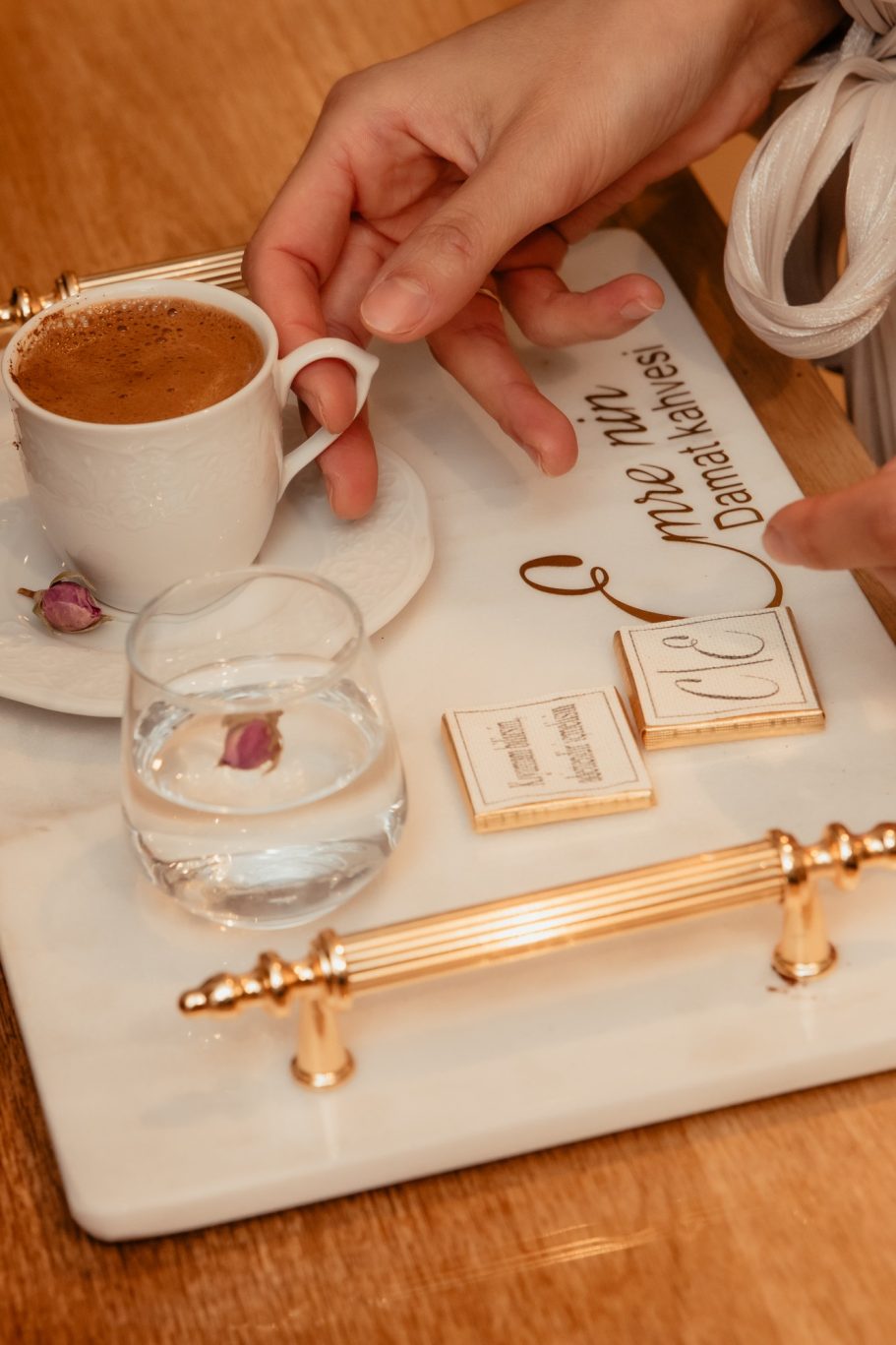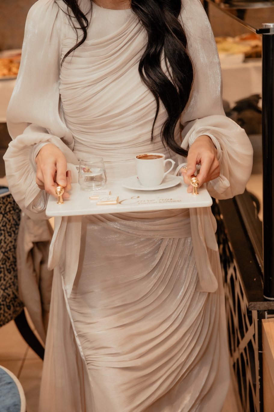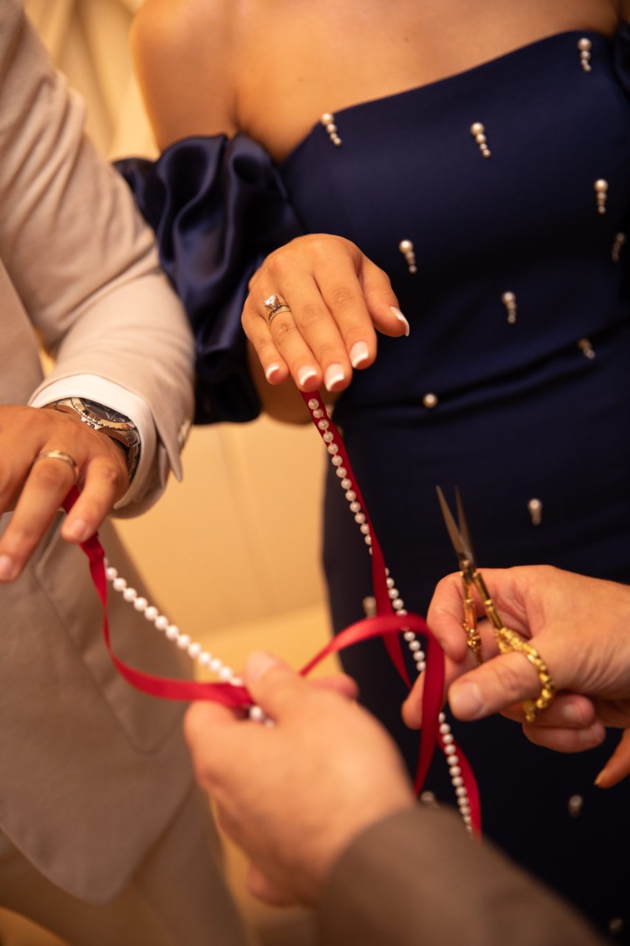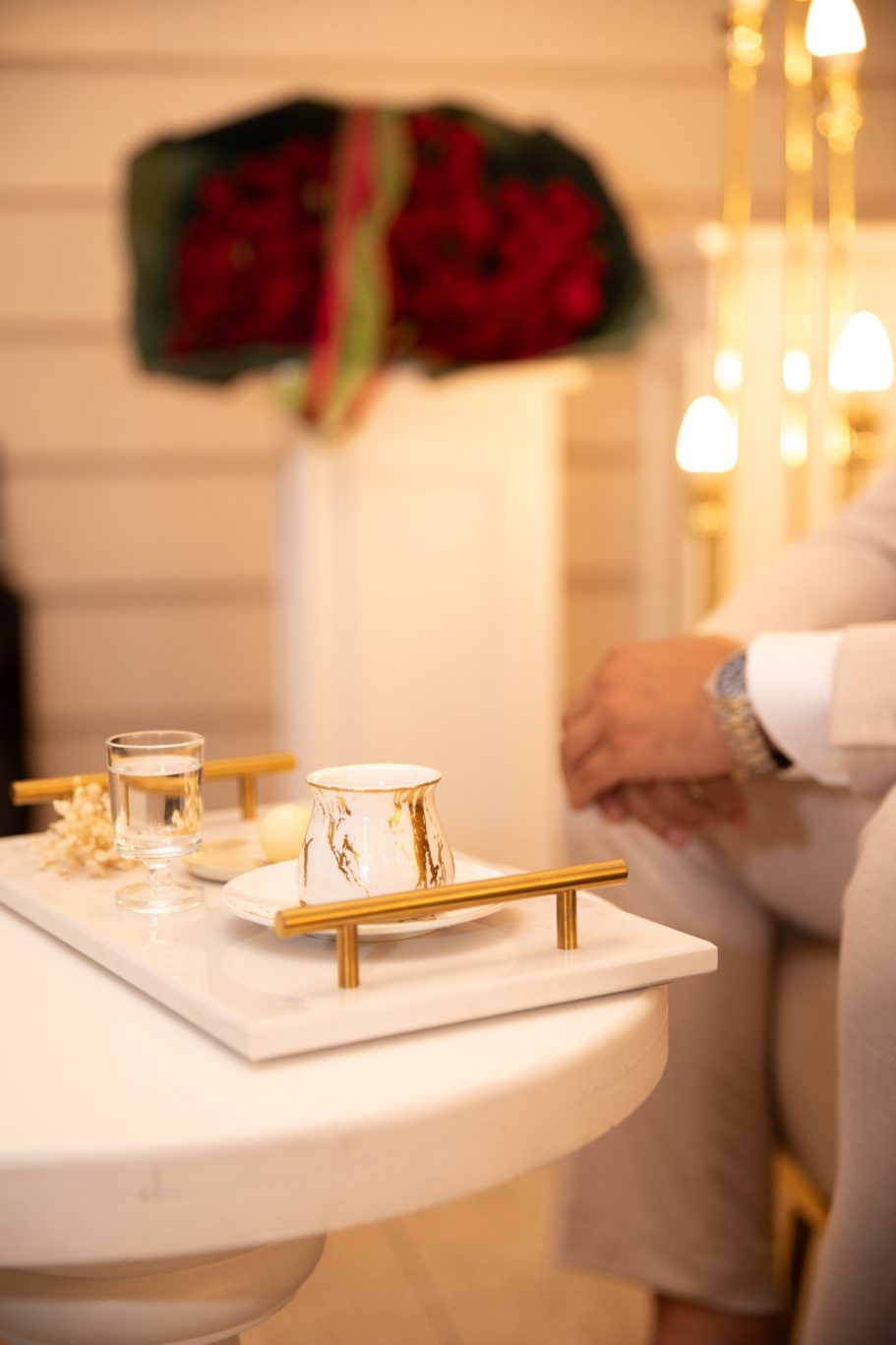 Tijdens de handvraag draait alles om traditie en samenzijn. Rode rozen vullen de kamer met liefde, terwijl de families samenkomen voor dit bijzondere moment. De tafel staat vol met cadeaus, lekkernijen en koffie, elk detail zorgvuldig gekozen. Zodra de families hun zegen geven, mag het lint tussen de ringen geknipt worden.